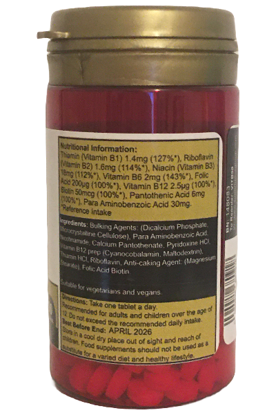 - Reduce tiredness and fatigue- Vitamin B6 & Pantothenic acid (Vitamin B5) & Vitamin B12 & Riboflavin (Vitamin B2) & Folic acid